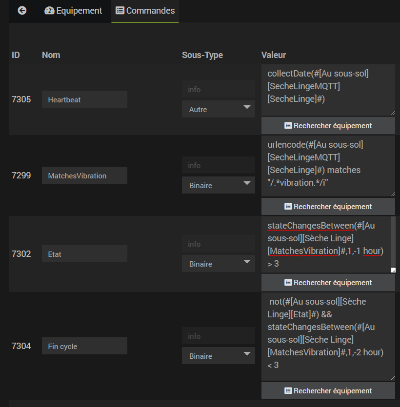 En gros, j’ai un capteur de vibration Aqara, et je « compte » le nombre de vibrations (matchesvibrations) pendant un période : Pas plus de 3 dans les deux dernières heures, et pas plus 3 dans l’heure précédente… (un peu redondant certes)