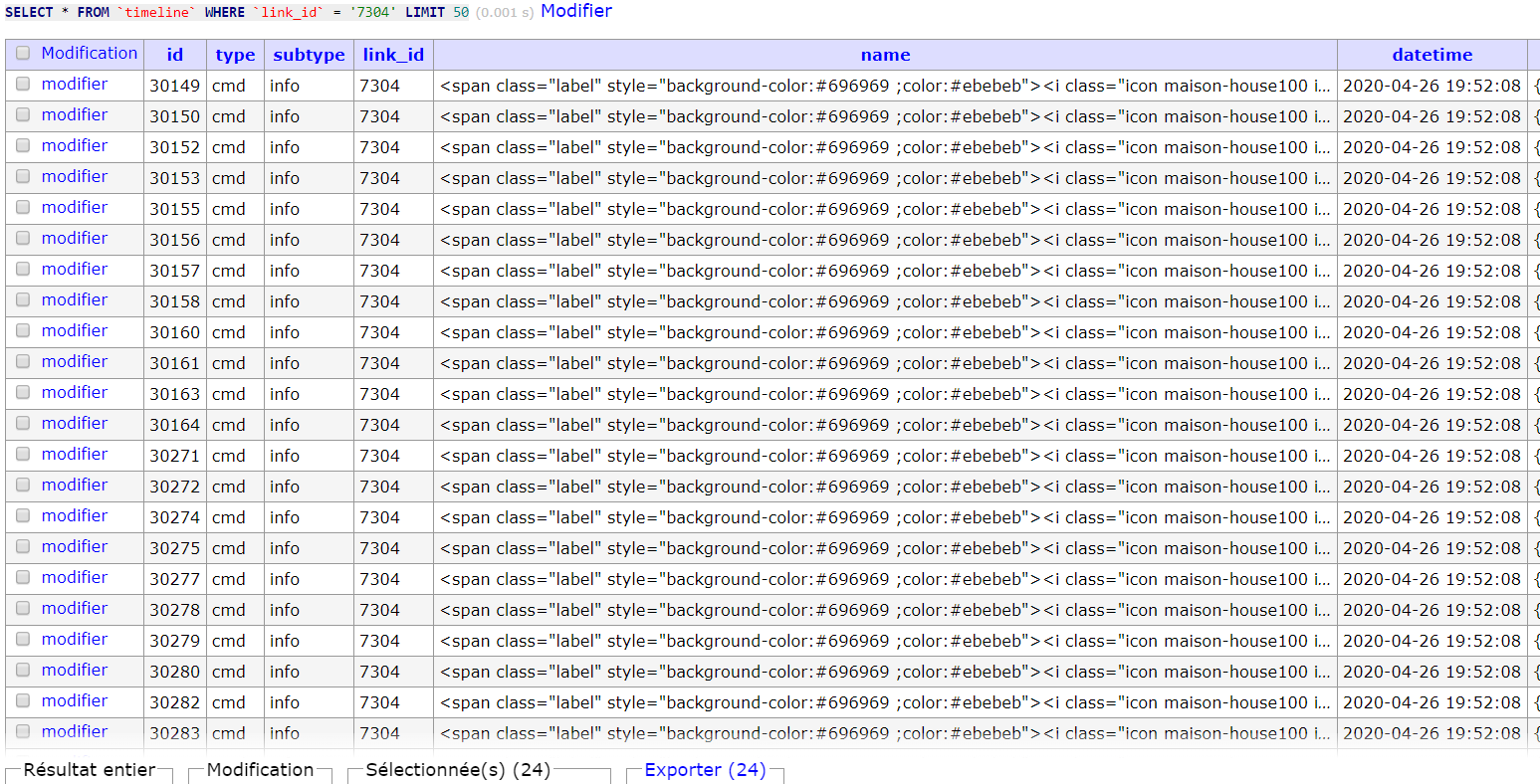 Je vais jeter un œil quand même, mais si y’a répétition c’est normale que la timeline le montre. C’est parce que l’historique n’est pas à la ms que tu le vois pas sur l’histo. Des répétitions dans la même seconde çà doit pas arriver souvent quand même, c’est quoi comme commande ??