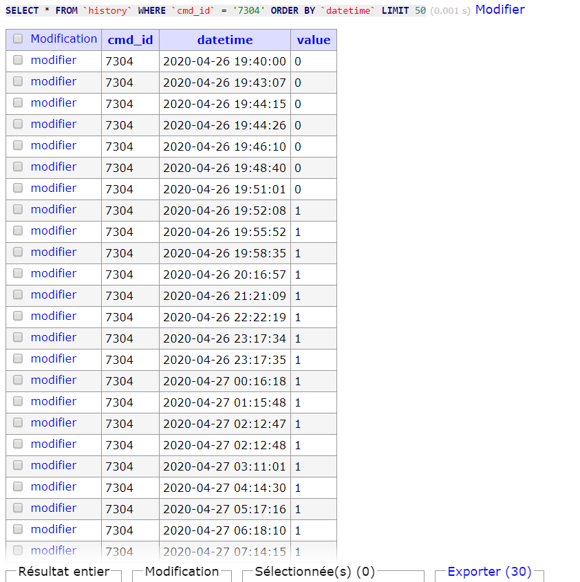 Pour tes répétitions à mon avis il y a eu répétitions dans la même minute, donc elles apparaissent dans la timeline. Mais, on ne peux avoir qu’une valeur à une heure:min donnée dans l’historique donc elle s’est fait écrasée et au final y’en a qu’une. L’historique serait à la seconde tu les verrais.
