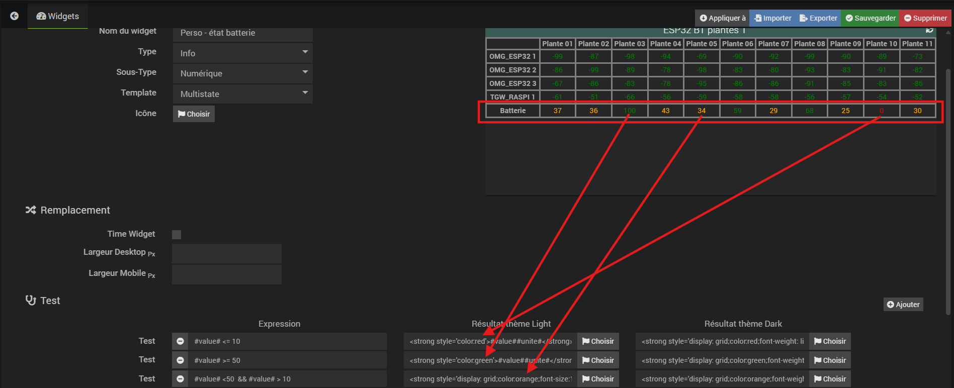 soit vert lorsqu’il est inférieur à 10 ou orange <20 et rouge au delà avec le même principe pour le delta ambiant