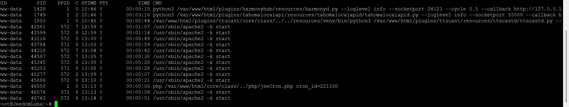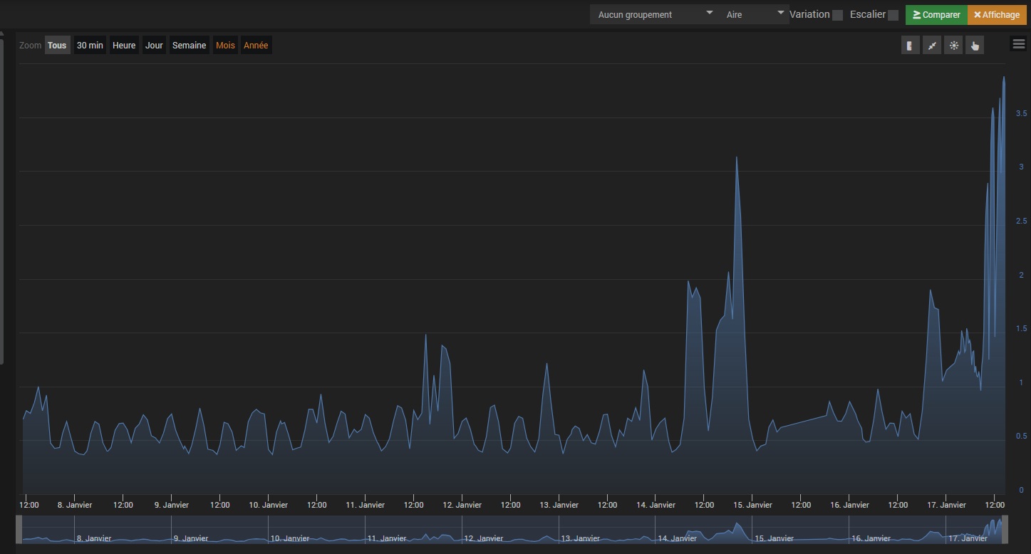 Ma Luna atteint 3.88 et 80°. Je vais essayer de lister un max d’infos pour qu’une âme génereuse m’aiguille sur les process posant probleme. Pas forcement de logique dans ces data, tout ne me parle pas forcement. Les images sont 1: sante jeedom 2: sudo ps -fu www-data 3: htop 4: charge CPU historisée ces derniers jours (les baisses du jour sont des redemearrages)