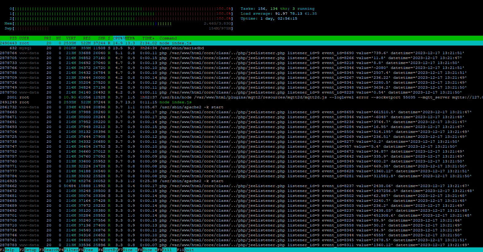 2578 1 32.2 0.9 /usr/bin/python3 /var/www/html/plugins/xiaomihome/resources/xiaomihomed/xiaomihomed.py --loglevel error --socketport 55019 --callback http://127.0.0.1:80/plugins/xiaomihome/core/php/jeeXiaomiHome.php --apikey --cycle 0.05 --pid /tmp/jeedom/xiaomihome/deamon.pid