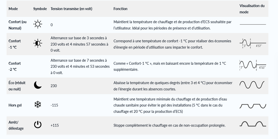 Bonjour @MauriceG @ngrataloup @rom.jou . Au cas où je signale que vu la nature des signaux attendus sur le fil pilote (variations du signal électrique) certains modes et transitions ne sont pas immédiats car ils nécessitent pour certains un motif de variation de tension sur plusieurs minutes. Dans mon cas avec des radiateurs Sauter compatibles 6 ordres, pour passer à Confort-1 depuis Confort je crois ou une autre transition vers Confort -2, mon module Qubino RAIL DIN envoie bien (ou débute) l’ordre et affiche un retour immédiat de la consigne. Néanmoins il faut qques minutes au radiateur pour afficher le mode Confort-1 (sans rien faire d’autre qu’attendre). Je mets ci-dessous un schéma rappelant le principe technique et variation de signal de tension attendue :