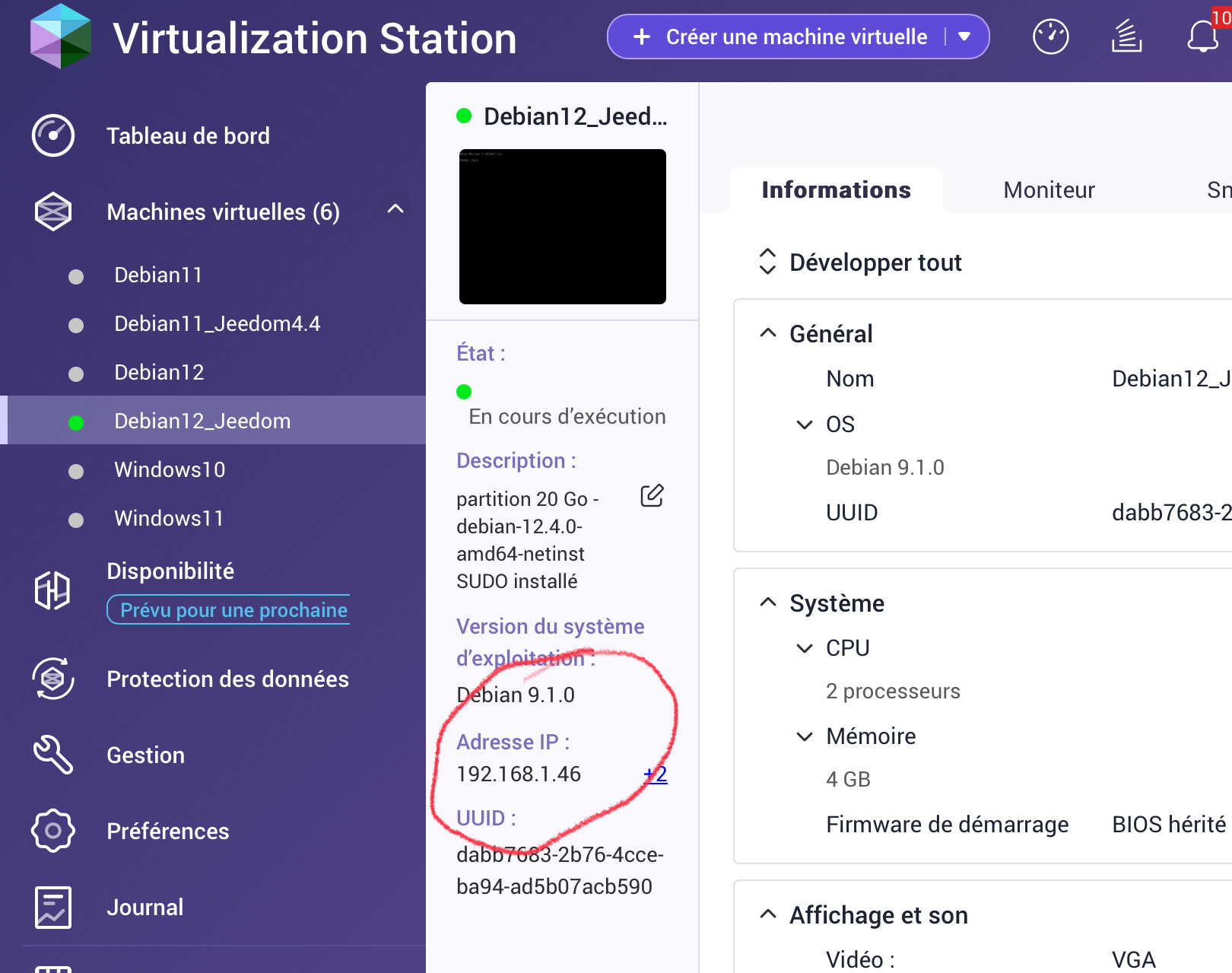 L’adresse IP n’apparaît pas ici mais dans virtualization station :