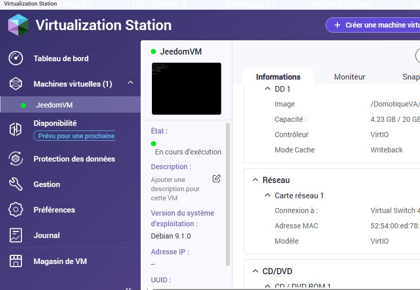 ça y est j’ai le matériel et j’ai installé virtualization station. J’ai créé la VM jeedom avec une image mais lorsque je la lance je n’ai pas d’adresse ip pour accéder à jeedom donc je pense avoir un souci avec mes commutateurs virtuels