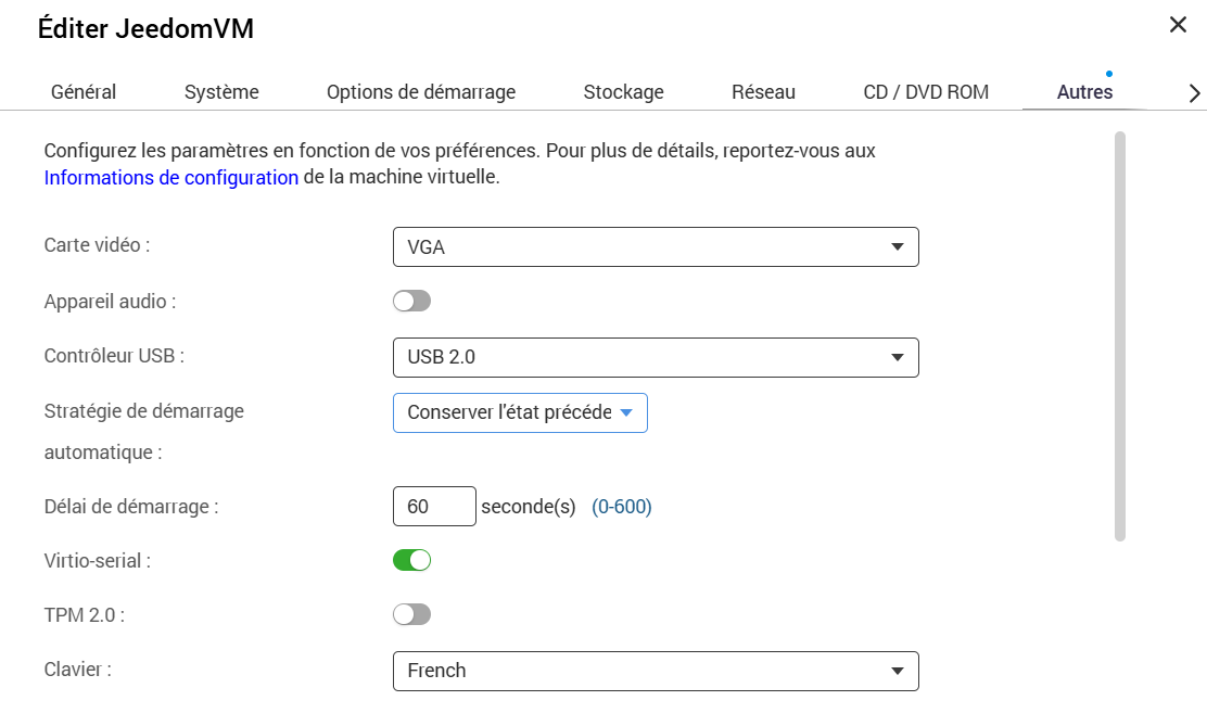 Maintenant au niveau de la VM Jeedom que faut-il mettre ? je suppose qu’il faut mettre « Conserver l’état précédent » ? si oui quel est le délai de démarrage ? c’est le démarrage du NAS ou de la VM ?