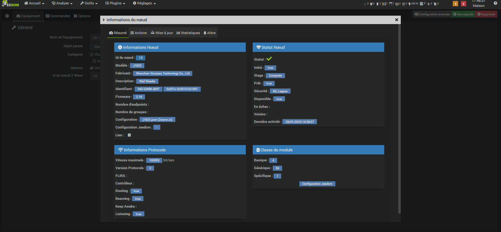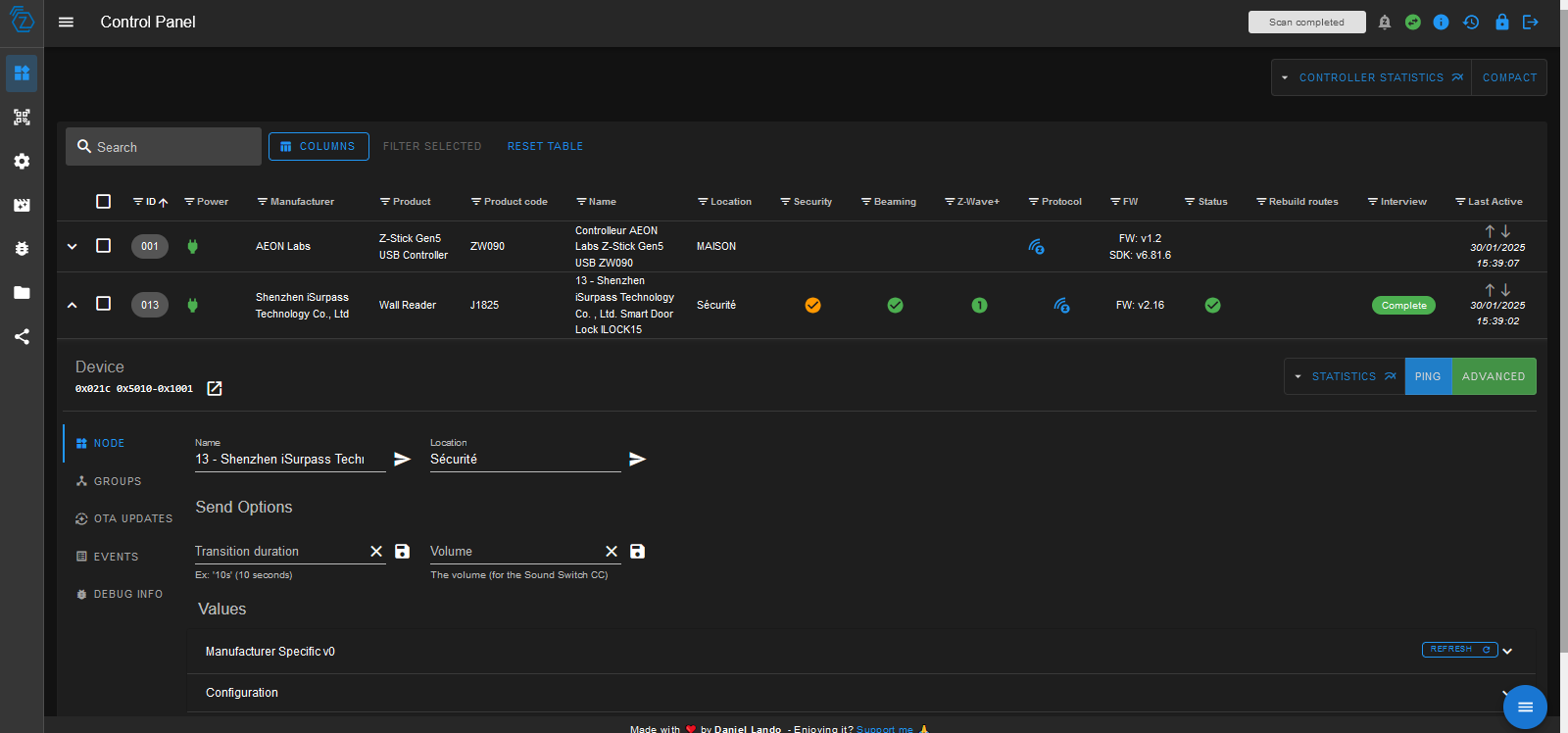 [2025-01-28 20:10:06] DEBUG : [createEqLogic] Création d\'un équipement {"id":24,"inited":true,"status":4,"isControllerNode":false,"interviewStage":5,"deviceClass":{"basic":"Routing End Node","generic":"Entry Control","specific":"Door Lock"},"zwavePlusVersion":1,"ready":true,"zwavePlusRoleType":7,"isListening":true,"isFrequentListening":false,"canSleep":false,"isRouting":true,"supportedDataRates":[40000,100000],"maxDataRate":100000,"supportsSecurity":false,"isSecure":false,"supportsBeaming":true,"protocolVersion":3,"firmwareVersion":"2.16","manufacturerId":540,"manufacturer":"Shenzhen iSurpass Technology Co. , Ltd.","productId":4097,"productDescription":"0x5010","productType":20496,"productLabel":"Unknown product 0x1001","deviceDatabaseUrl":"https:\/\/devices.zwave-js.io\/?jumpTo=0x021c:0x5010:0x1001:2.16","keepAwake":false,"protocol":0}