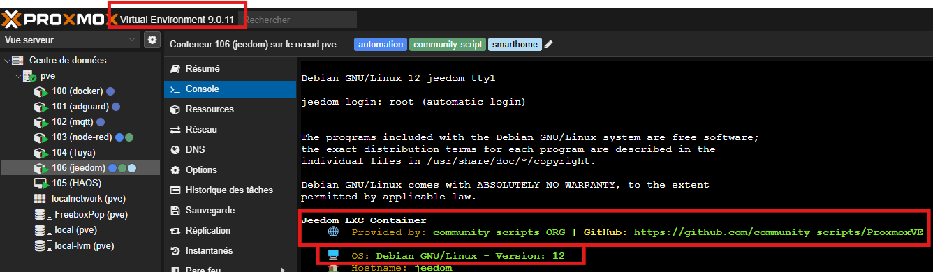 J’avais l’idée de faire une backup de secours/test dans PROXMOX. J’ai utilisé pour le moment le script de Mips dispo ICI pour lancer jeedom en LXC (solution rapide et source fiable)