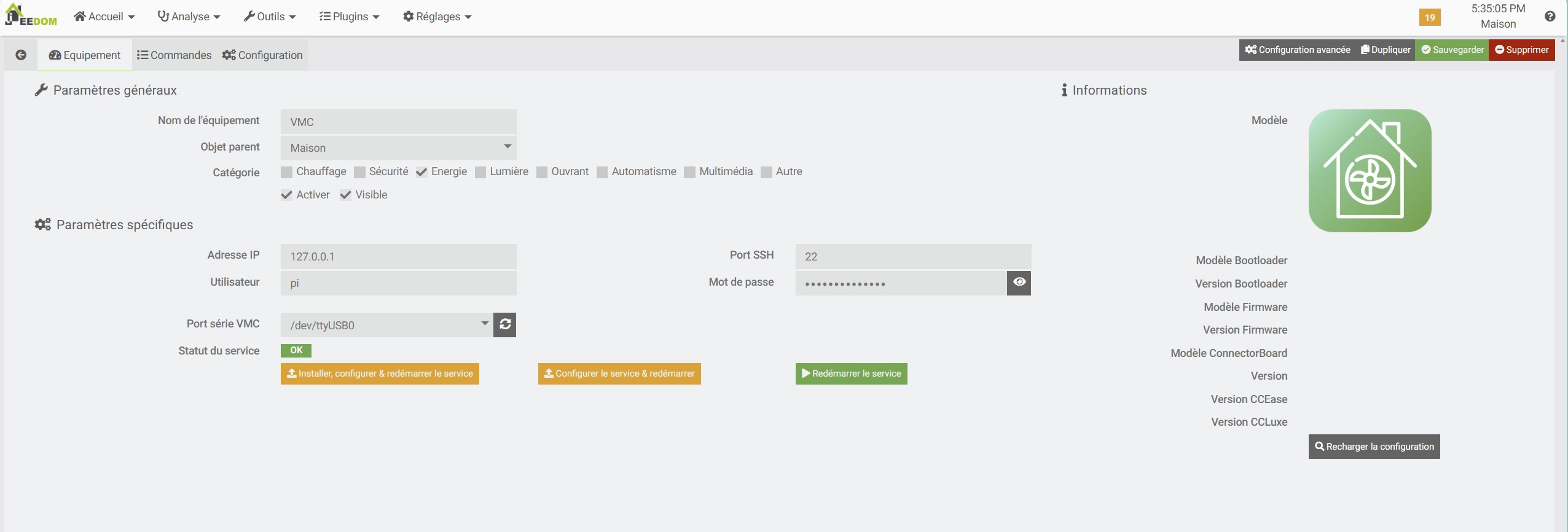 Merci pour l’aide, tout fonctionne. Ce week-end, je vais refaire l’installation proprement avec un RPI Zero 2W et un connecteur RS232 plus compact, histoire de pouvoir fermer la VMC. En attendant, je me suis servi du plugin widget onduleur pour représenter les flux. Ce n’est pas parfait, mais c’est déjà pas mal. Le petit point bouge et ca fait son petit effet