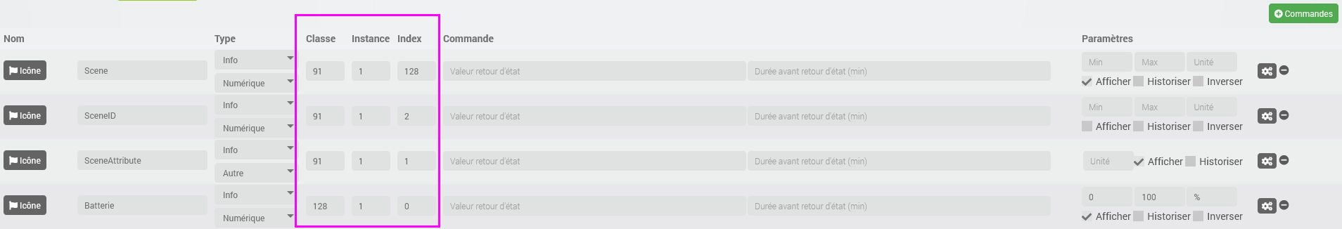 Si les commandes attendues n’apparaissent pas dans Valeurs, il est nécessaire d’exclure puis ré-inclure le module.