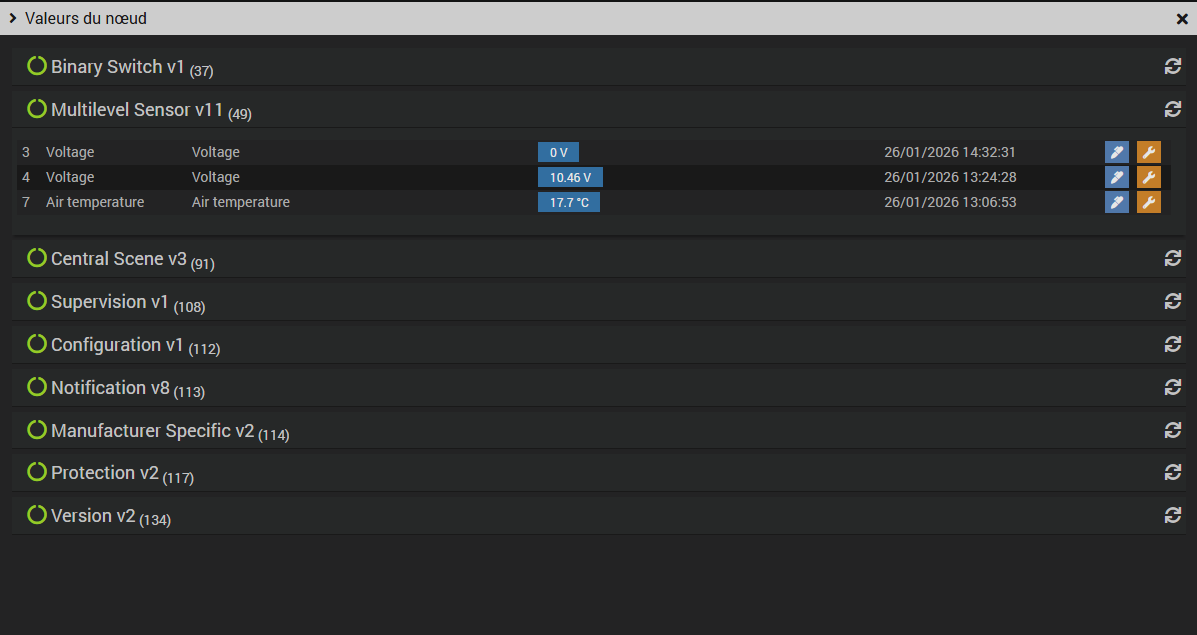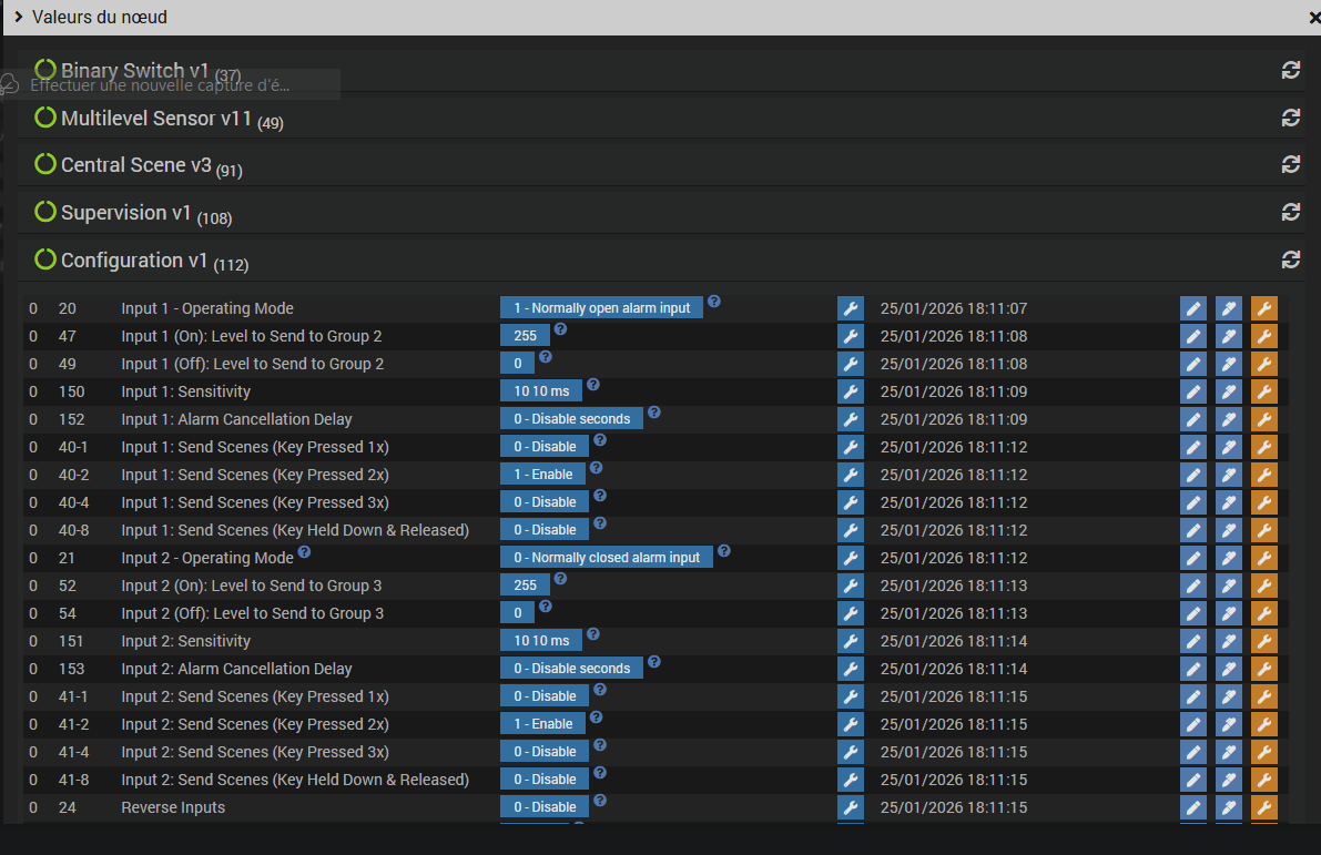 Bonjour, suite au passage sur debian 12, j’était contraint à installer Zwavejs, comme le plugin open Z-wave ne fonctionnait plus. Tous mes modules sont bien reconnu sauf pour mes 2 implants FGBS222 ou je n’ai pas toutes les commandes (input 1 input 2 etc…) mais il m’a créer des commandes Etat 5 et Etat 6 et les commandes pour températures. Donc je voulais savoir comment je fais pour récupérer mes commandes pour pouvoir remplacer le module de open Zwave vers Zwavejs. (par contre dans zwavejs, je vois les commandes dans la configuration de