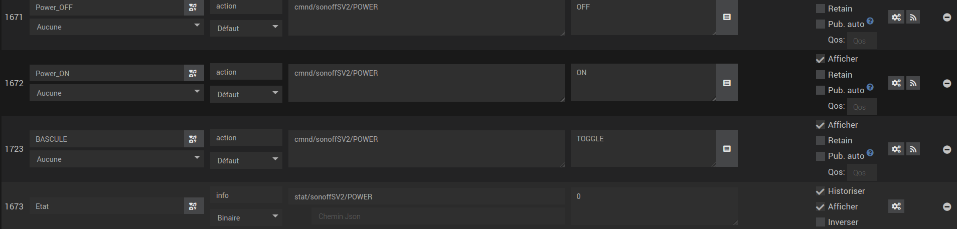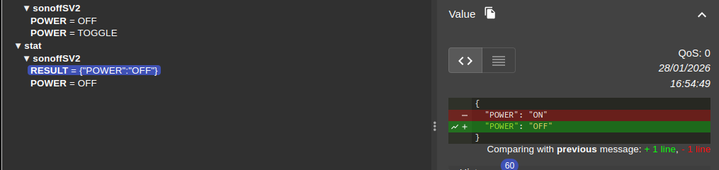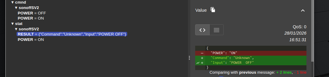 Sur 2 Sonoff SV parmi 4 (S20 et TH qui fonctionnent correctement), la commande POWER OFF (cmnd/sonoffSV2/POWER OFF) généré par le plugin jMQTT n’est pas reconnue (trace sur MQTT explorer dans le broker Mosquito installé en local).