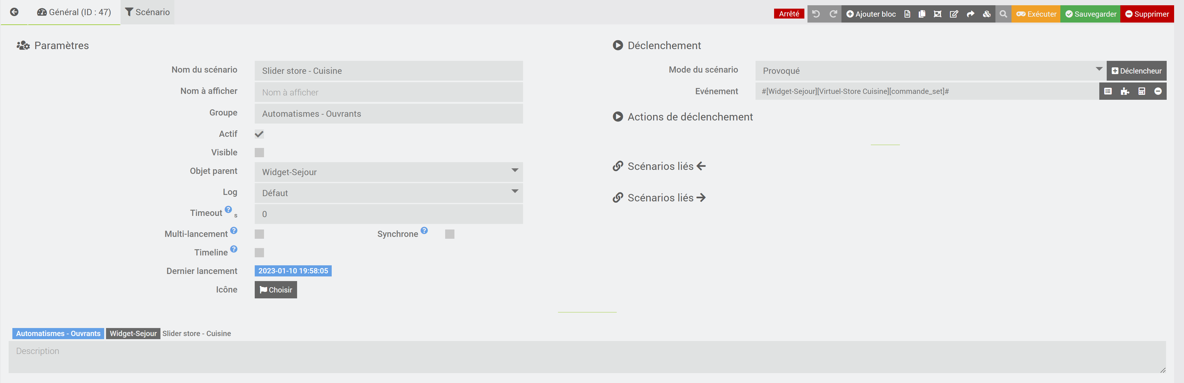 un pour controler le temps de montée en fonction du ratio 0-100% déclenché par le slider virtuel. La temporisation de mon store est de 32 secondes, en fonction de la durée d’ouverture vous devrez modifier la formule dans la variable.