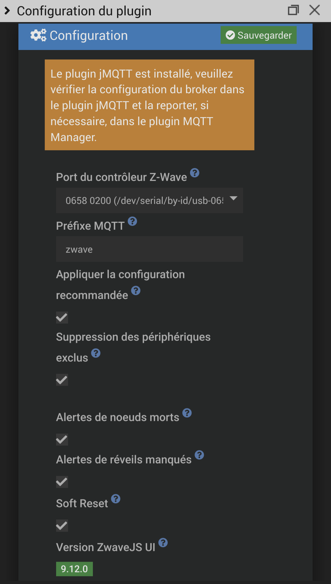 Ah oui pardon j’ai oublié la page de config zwave-js. J’ai une clé Aeotec, et le paramétrage du plugin est le suivant (inchangé à ma connaissance depuis le début) :