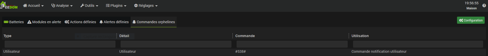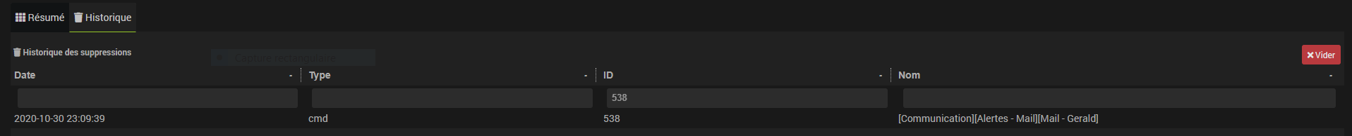 Merci. Dans Résumé Domotique / Historique j’ai trouvé la commande qui pose pbr mais je ne vois tjs pas l’id 538 !!!