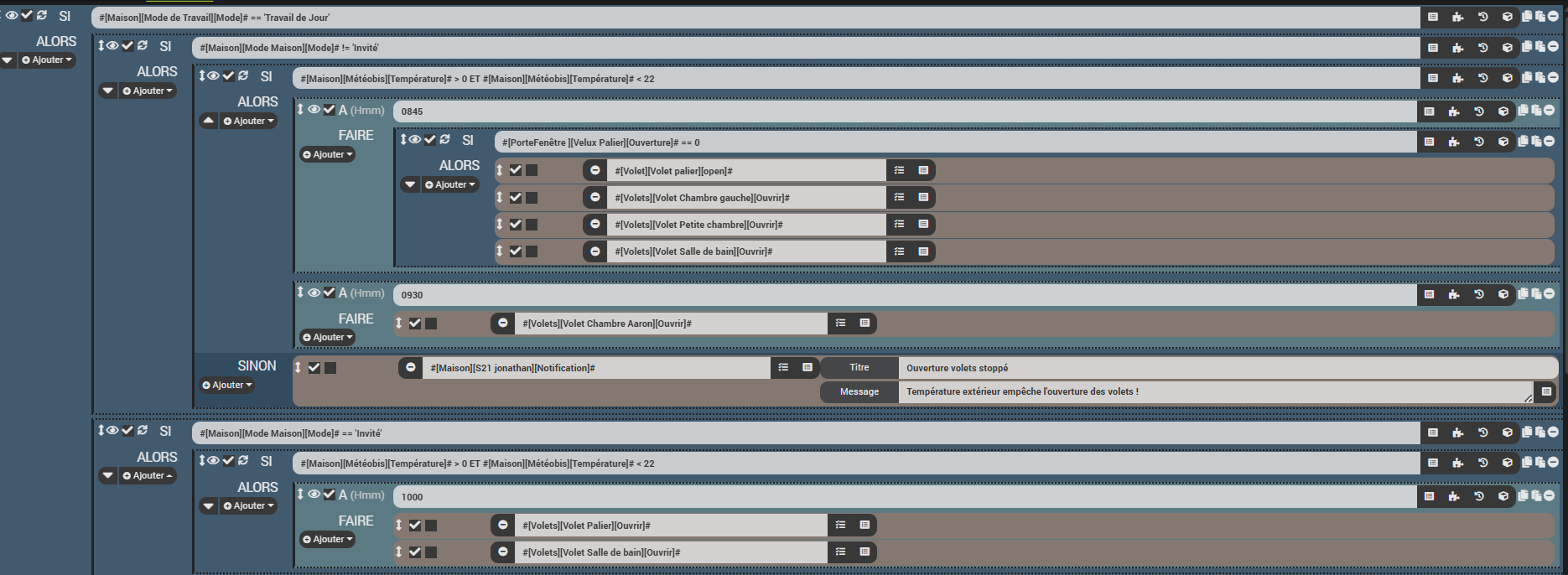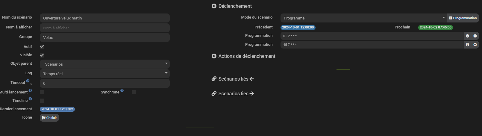 Ya un lancement a 7h45 et un autre a 12h, ce scenarios fonctionne depuis 2ans, le seul changement ce sont les commande d’origine qui ont changer vu que j’ai changer de plugin, mais tout passe par des virtuel, et ces virtuels sont fonctionnels.