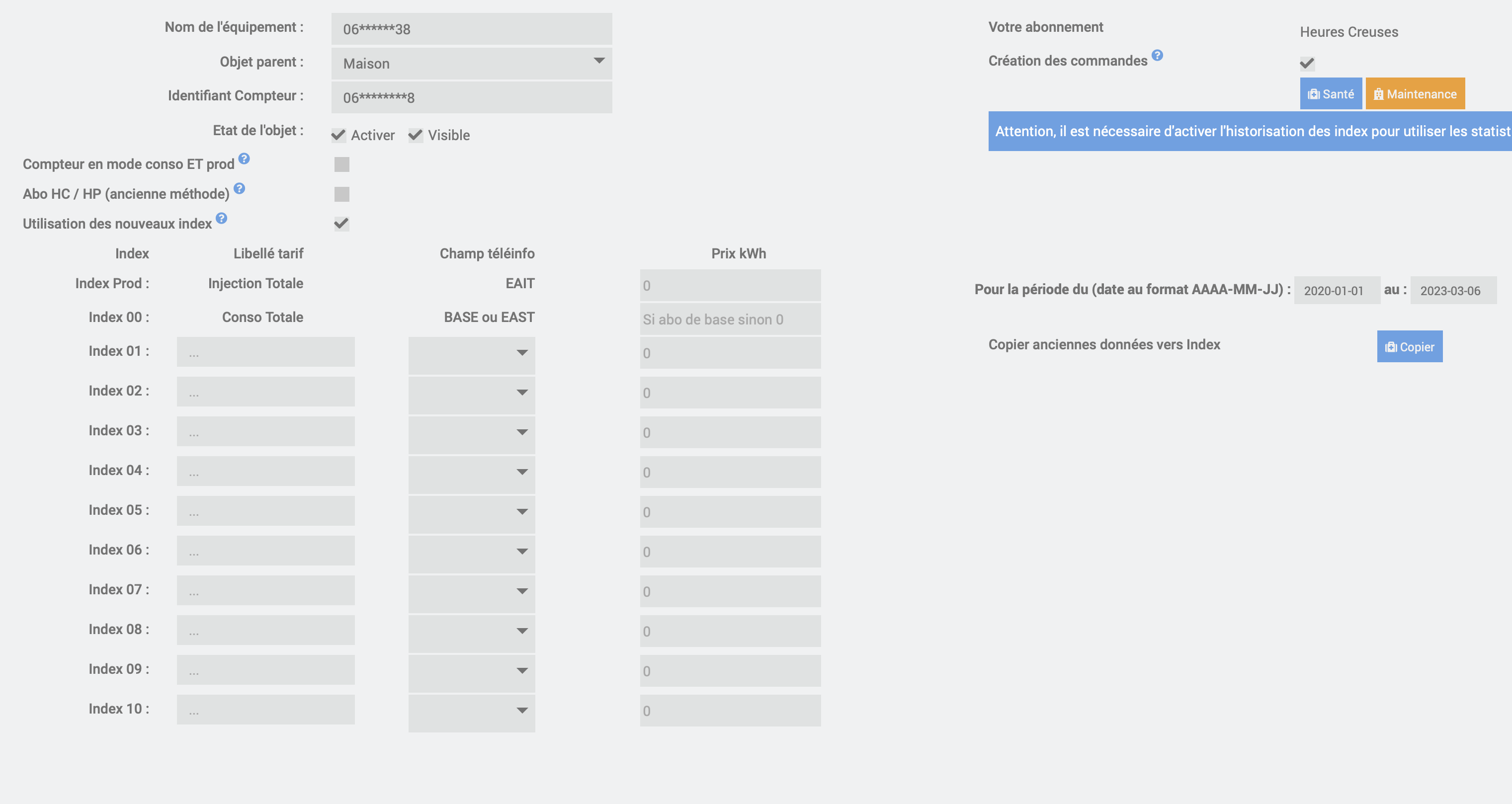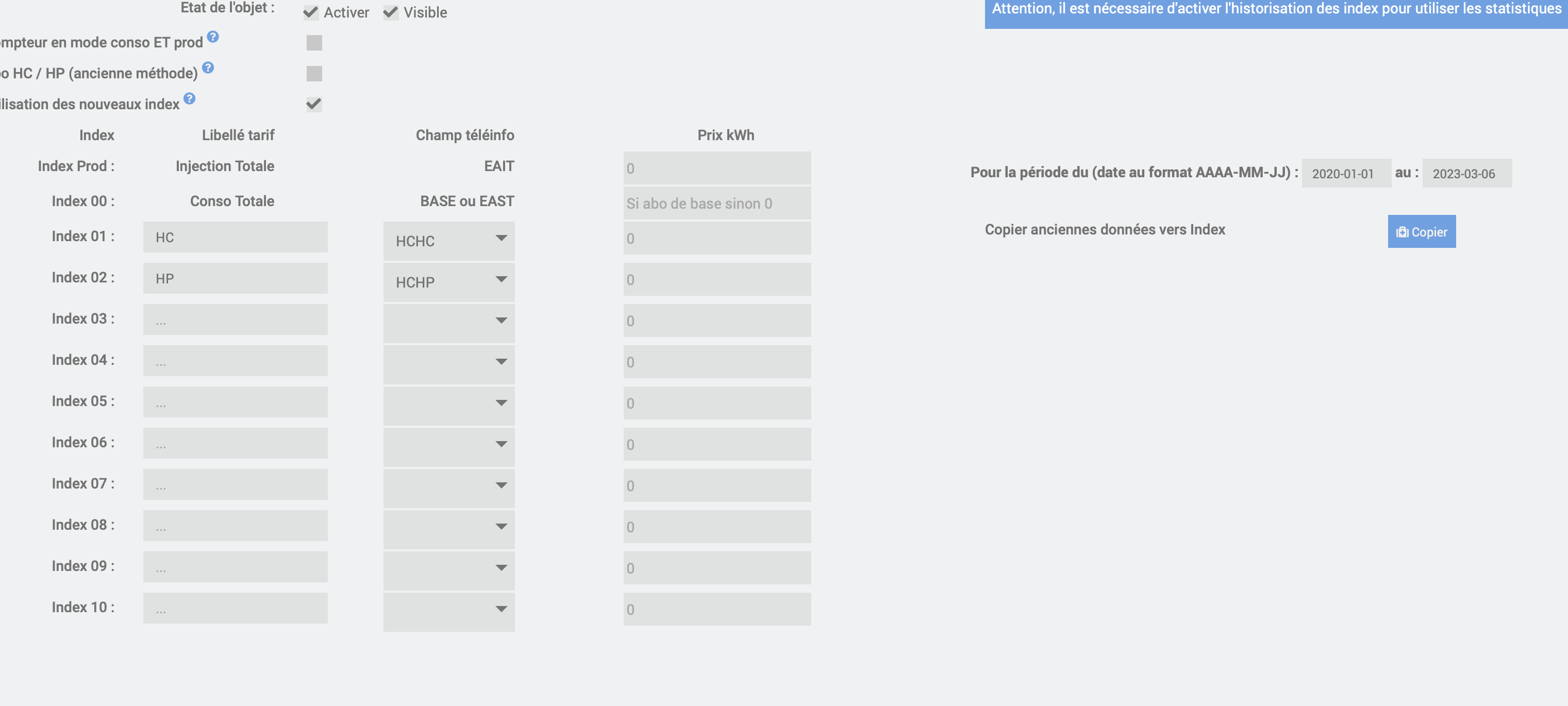 Alors maintenant dans le plugin tu as 2 possibilités, les « anciens index » et les « nouveaux index ». Là tu as coché pour utiliser les nouveaux mais tu ne les as pas complétés. Il faut que tu mettes en index01 un libellé pour HP par exemple et que dans le champs tu sélectionne « HCHP » et de la même manière en index02 toutes les infos correspondant aux heures creuses.