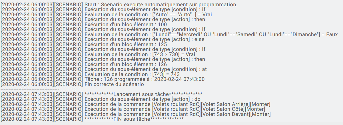 Le souci c’est que ce matin j’ai oublié que mes enfants n’avaient pas à se lever, du coup je suis passé en mode « manu » mais vers 6h40. La problématique c’est que le scénario avait déjà lancé la commande et du coup à 7h43 les volets se sont ouverts.