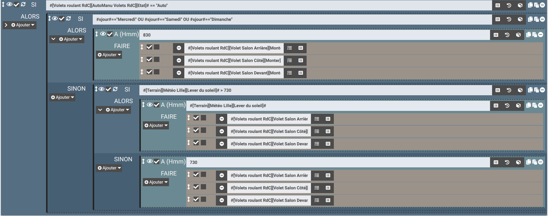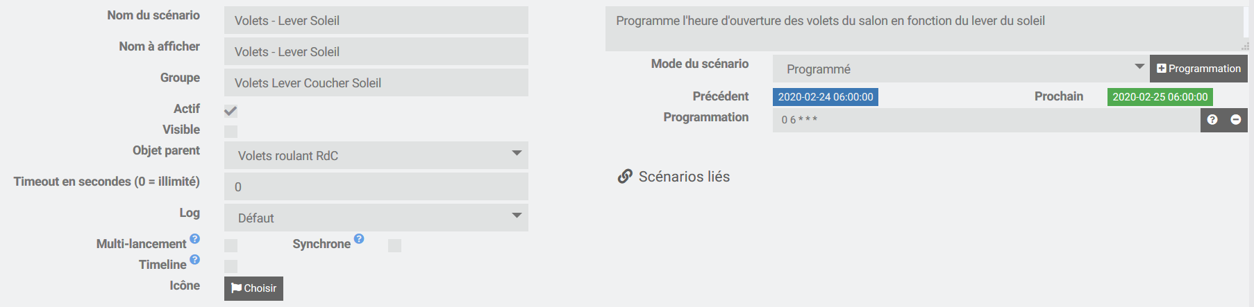 J’ai réalisé un scénario qui me permet de lever mes volets de la maison en fonction du levé du soleil, des jours de la semaine ect…