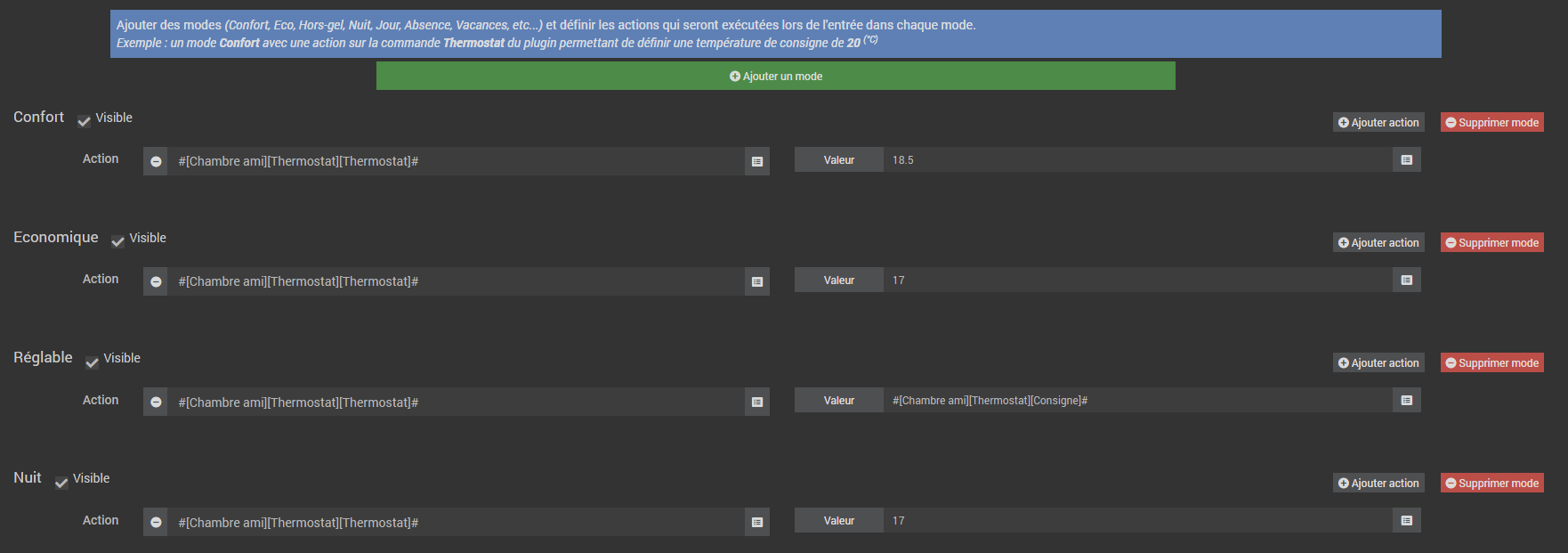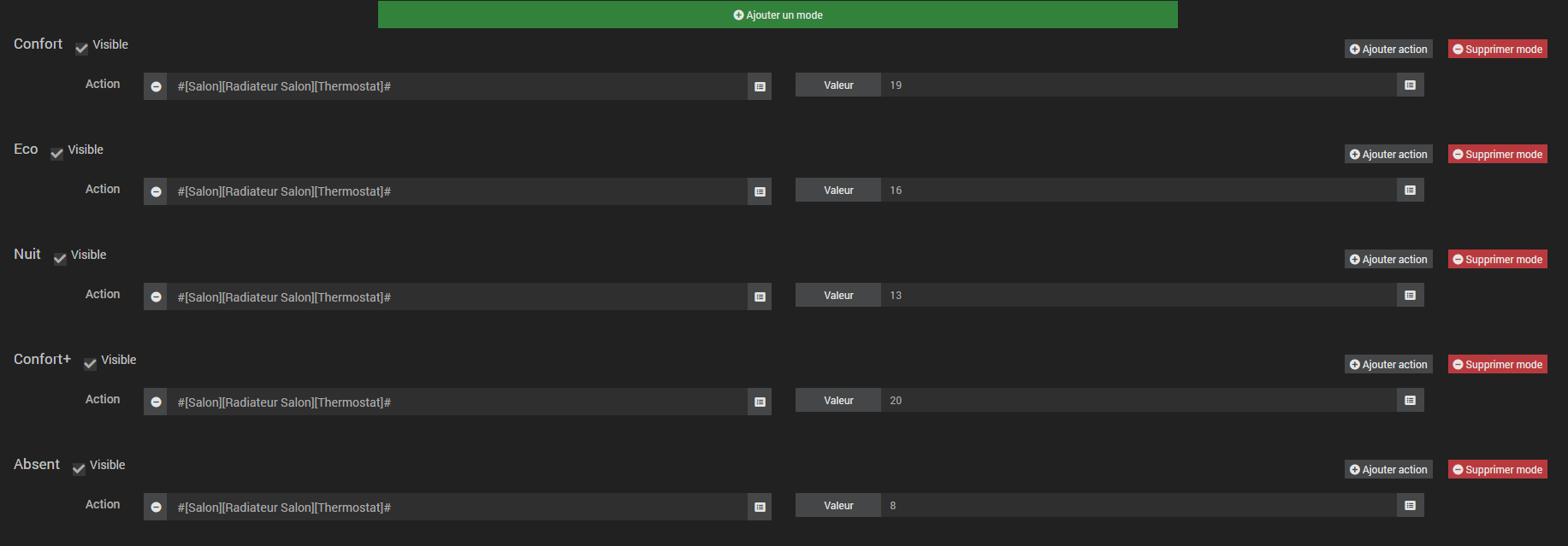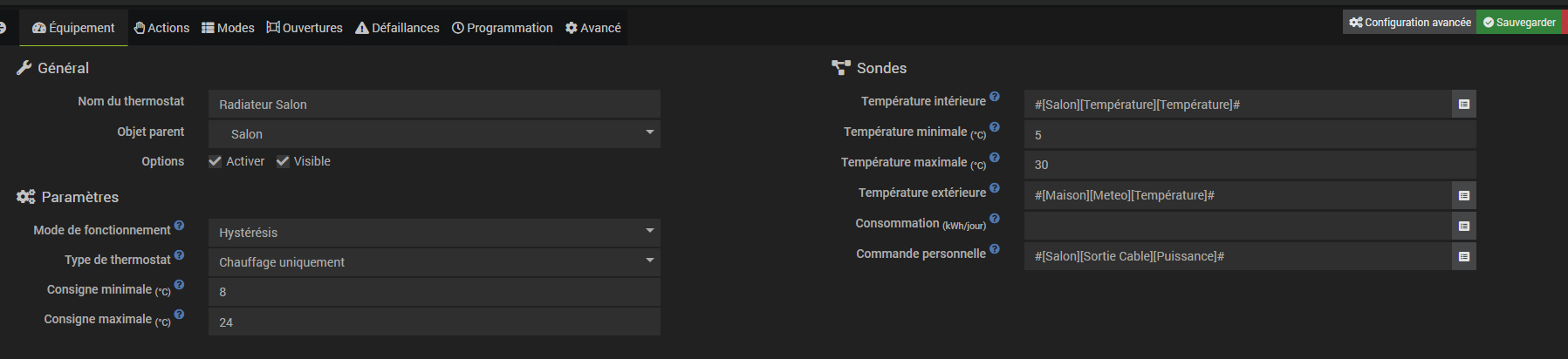 Et rien d’autre. Reste ensuite à configurer le plugin avec les valeurs min, max, créer les modes (qui sont complétement décorrélés des modes ‹ confort ›, ‹ économique ›, ‹ arrêt ›,… du FP ou du thermostat du radiateur…), définir le comportement si ouverture des fenêtres, etc…
