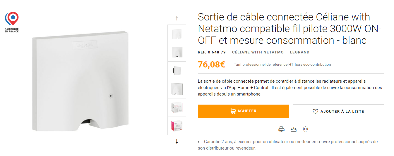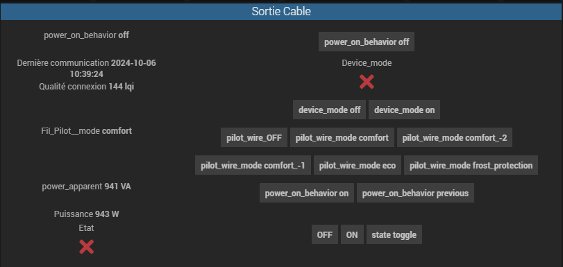 A la base, il s’agit donc d’un module Zigbee qui pilote un relais pour le FP (le module ‹ Sortie de câble connecté Legrand ›), et du côté convecteur, un classique donc si on excepte toute son électronique qui ne servira de toute façon plus à rien (sauf comme thermostat de sécurité si Jeedom se plante). Celui-ci doit être connecté sur la phase, le neutre, et le fil pilote vers la sortie FP de la sortie de câble Legrand. A noter qu’il n’y a pas de terre, mais cela ne me surprend pas, la plupart des appareils de chauffe étant en classe 2 maintenant, la mise à la terre est interdite.