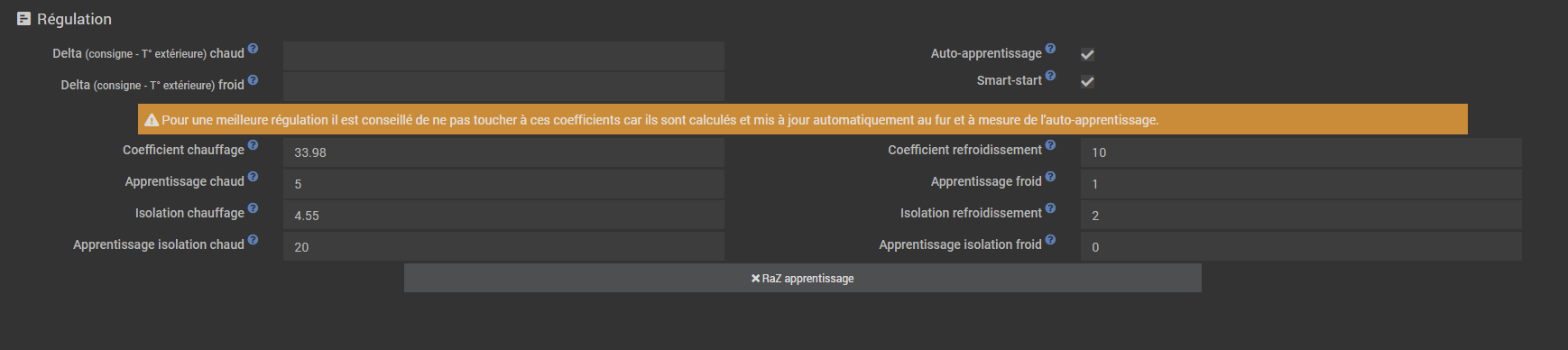 Dans la partie régulation, qu’il n’y a pas lieu de toucher à priori sauf pour faire une éventuelle RAZ, le plugin est bien défini en mode auto-apprentissage ?