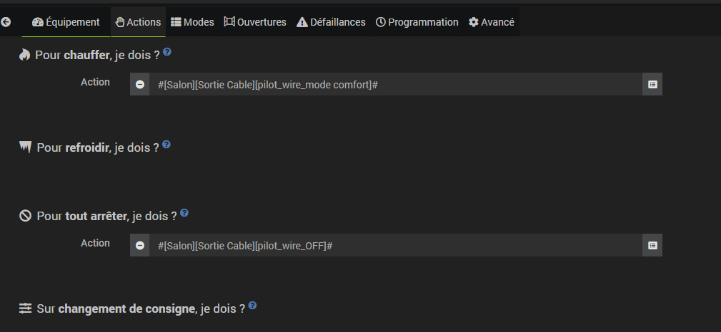 Note : les commandes ‹ pilot_wire_mode eco › (alternance complète), ‹ pilot_wire_mode comfort_-1 › (alternance de 3" toutes les 4’57"), pilot_wire_mode_confort_-2’ (alternance de 4" toutes les 4’53"), et ‹ pilot_wire_mode frost_protection › (demi alternance négative) ne devraient pas être gérés en utilisant le plugin thermostat.