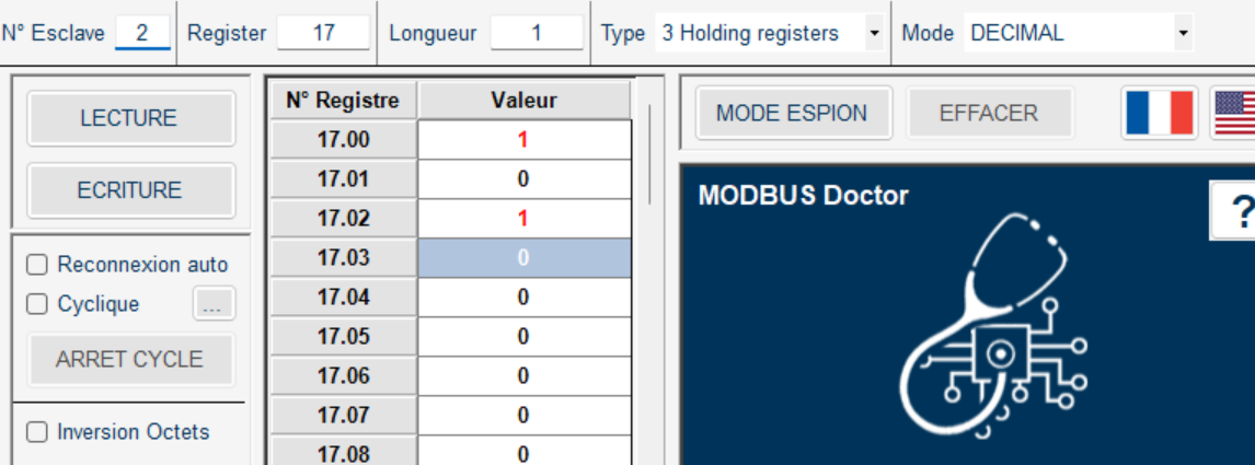 Sur modbusDoctor j’écris directement sur les bits.