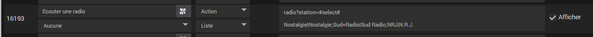 la commande du plugin Amazonmusic est automatiquement en mode liste, je n’ai rien modifié, il faut simplement bien respecter la syntaxe: non Spotyfi de la radio , le signe + à la place d’un éventuel espace|nom affiché dans la liste et ça roule comme ça.