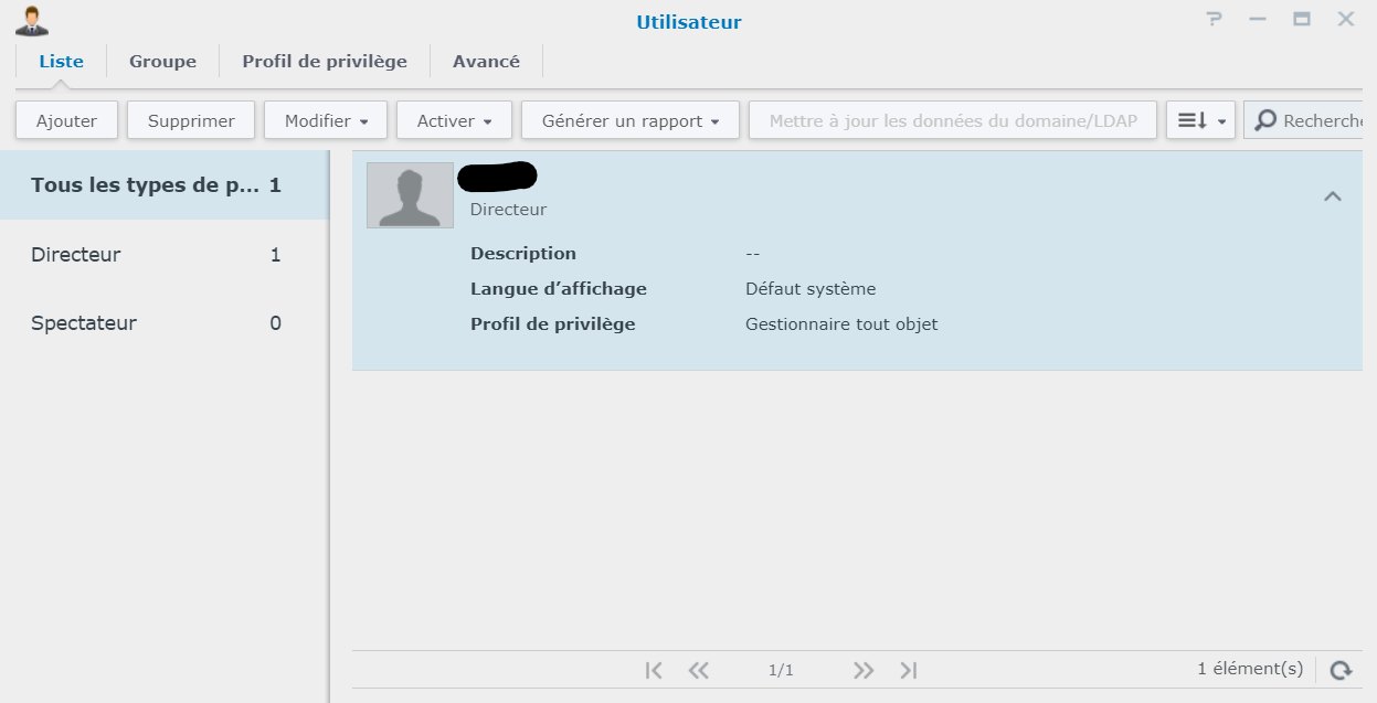 J’ai l’impression que tu as créé des groupes dans surveillance station. Peut être que le problème vient de là. Je n’ai qu’un seul utilisateur et je lui ai donné le privilège directeur. Du coup sur la page profil, il est en « gestionnaire tout objet », alors que toi tu as 0.