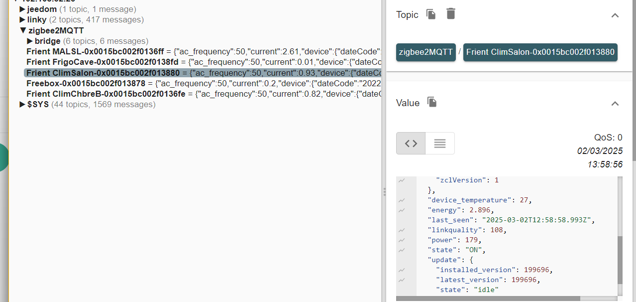 Si je supprime l’équipement dans jeezigbee et zigbee2mqtt que je réinitialise la prise Frient, après une nouvelle inclusion le client mqtt réapparait dans zigbee2mqtt mais avec les valeurs des données qu’il avait avant sa suppression.