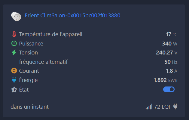 Je suis toujours en pleine réinstallation de mes 8 prises Frient zigbee dans jeezigbee (z2m). Sur ces 8 prises j’en ai récupéré 6, sur ces 6 je n’en ai inclus « correctement » que 4, qui me permettent d’historiser le Commande « Consommation ». Donc sur ce 6 prises, j’en ai 2 qui me posent des problèmes que je n’arrive pas à régler.