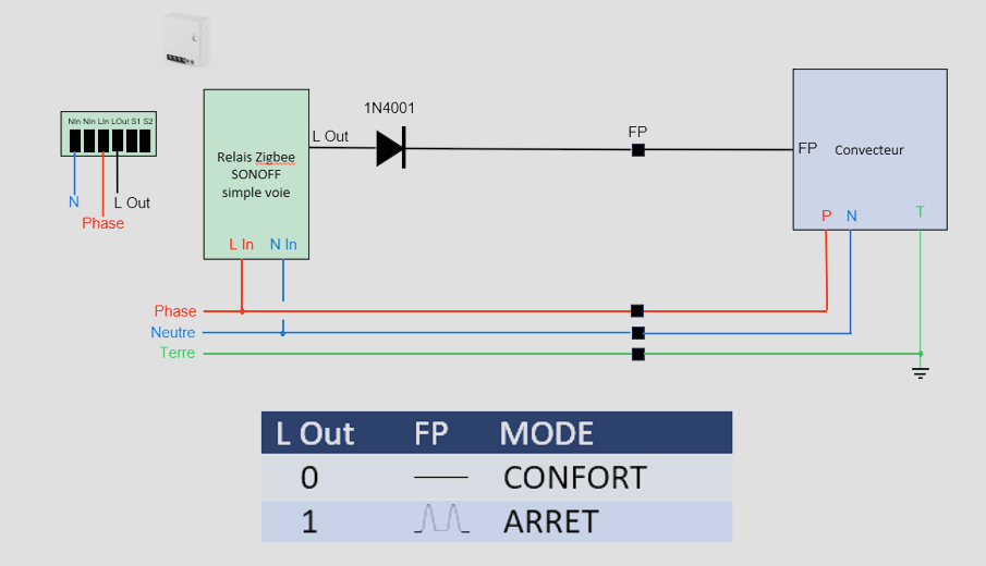 Mon objectif est de pouvoir piloter ces radiateurs à distance via une box domotique, en utilisant le fil pilote déjà passé jusqu’au tableau électrique, et de pouvoir :
