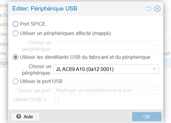 Il faut aller sur ta VM dans l’interface Proxmox puis hardware puis ajouter usb.