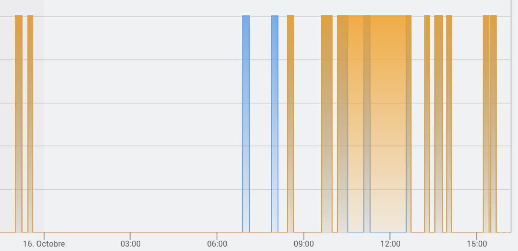 Un détecteur de présence sert d’évènement déclencheur à un scénario qui allume la lampe si 1 et l’éteint si 0. Rien de bien original. Tous les déclenchements, 0 comme 1, sont bien visibles dans la timeline, mais des fois niveau lampe ça fonctionne (souvent), des fois ça ne fonctionne pas (et il n’y a pas de préférence statique pour le 0 ou le 1). On dirait que la lampe ne reçoit parfois tout simplement pas la commande d’allumage ou d’extinction (qui est a priori bien émise par Jeedom). Je vous met le graphique de l’historique pour illustrer (en bleu le détecteur, en orange la lampe). La qualité de réception est de 120 lqi (pas fou, mais ok). Il m’est même arrivé d’avoir cette perte de fonctionnement sur plusieurs jours, m’obligeant à débrancher la lampe et la rebrancher (ça reste rare cependant).