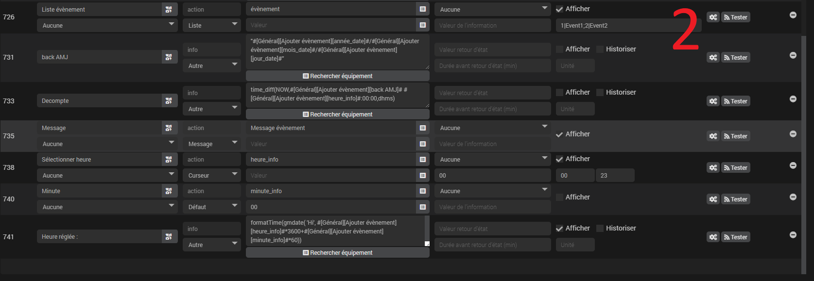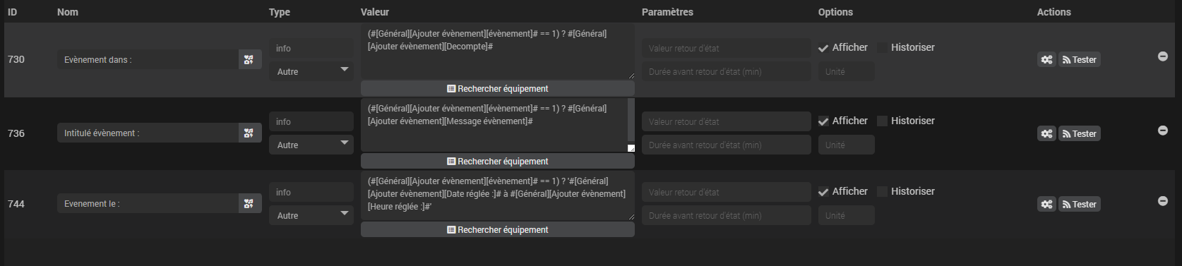 Seul soucis que je n’arrive pour l’instant pas à résoudre c’est le maintiens de l’information sur le virtuel Event1. En effet, quand je change d’évent dans le menu déroulant, les informations s’efface. Quand on visualise la configuration du virtuel c’est tout à faire normal. Mais je ne trouve pas de syntaxe qui puisse faire retenir l’information.