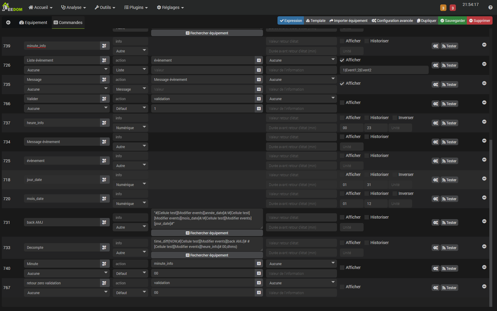 Scénario de sauvegarde des évènements avec syntaxe « event » (déclencheur : validation dans le virtuel du modificateur, qui est mis à 1 dans les réglages de la commande message):