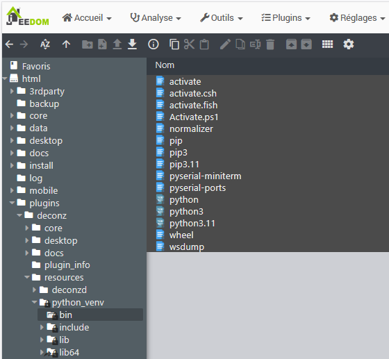 Nota : Après l’installation du plugin deconz les droits sont incorrects (cadenas) sur le dossier python_venv :