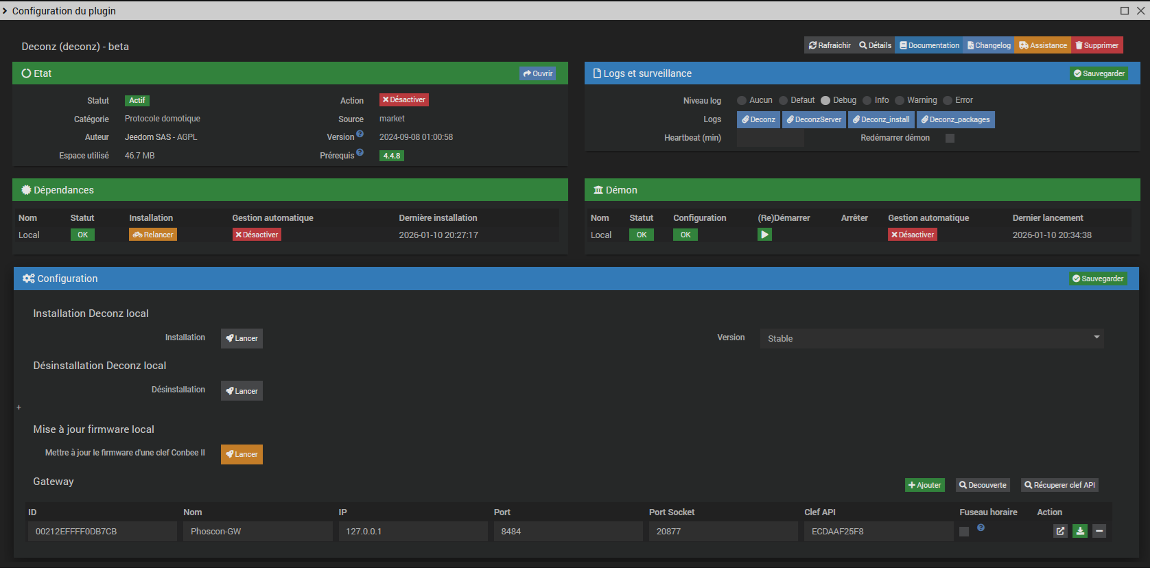il est conseillé d’installer deconz uniquement via le plugin deconz (installer à nouveau pour faire une mise à jour si disponible dans jeedom).