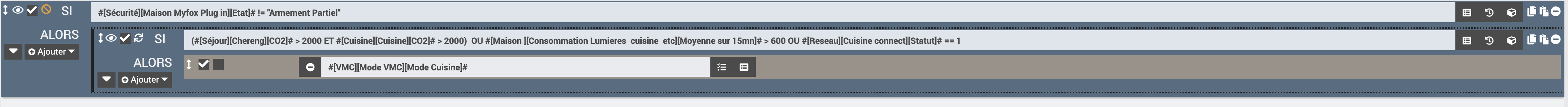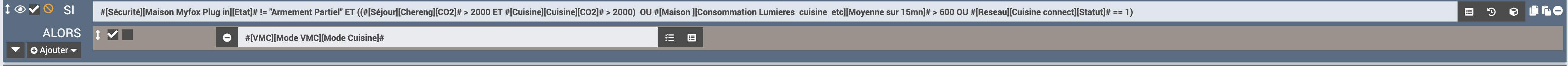 #[Sécurité][Maison Myfox Plug in][Etat]# != "Armement Partiel ET ((#[Séjour][Chereng][CO2]# > 2000 ET #[Cuisine][Cuisine][CO2]# > 2000) OU #[Maison ][Consommation Lumieres cuisine etc][Moyenne sur 15mn]# > 600 OU #[Reseau][Cuisine connect][Statut]# == 1)