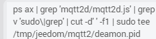Tu as quoi comme retour à ps ax | grep 'mqtt2d/mqtt2d.js' | grep -v 'sudo\|grep'