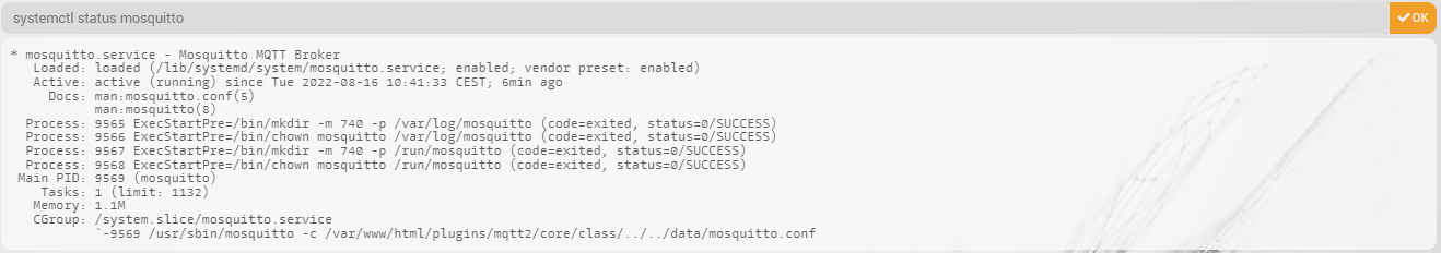0000|[2022-08-16 14:49:18]INFO : Lancement démon mqtt2 : sudo /usr/bin/node /var/www/html/plugins/mqtt2/resources/mqtt2d/mqtt2d.js --loglevel debug --socketport 55035 --mqtt_server mqtt://127.0.0.1:1883 --username --password --callback http://127.0.0.1:80/plugins/mqtt2/core/php/jeeMqtt2.php --apikey KKKKKKK --cycle 0.3 --pid /tmp/jeedom/mqtt2/deamon.pid
