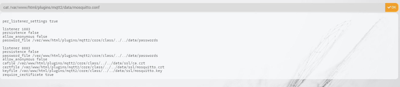 0030|[2022-08-16 14:52:20]INFO : Lancement démon mqtt2 : sudo /usr/bin/node /var/www/html/plugins/mqtt2/resources/mqtt2d/mqtt2d.js --loglevel debug --socketport 55035 --mqtt_server mqtt://127.0.0.1:1883 --username --password --callback http://127.0.0.1:80/plugins/mqtt2/core/php/jeeMqtt2.php --apikey KKKKK --cycle 0.3 --pid /tmp/jeedom/mqtt2/deamon.pid