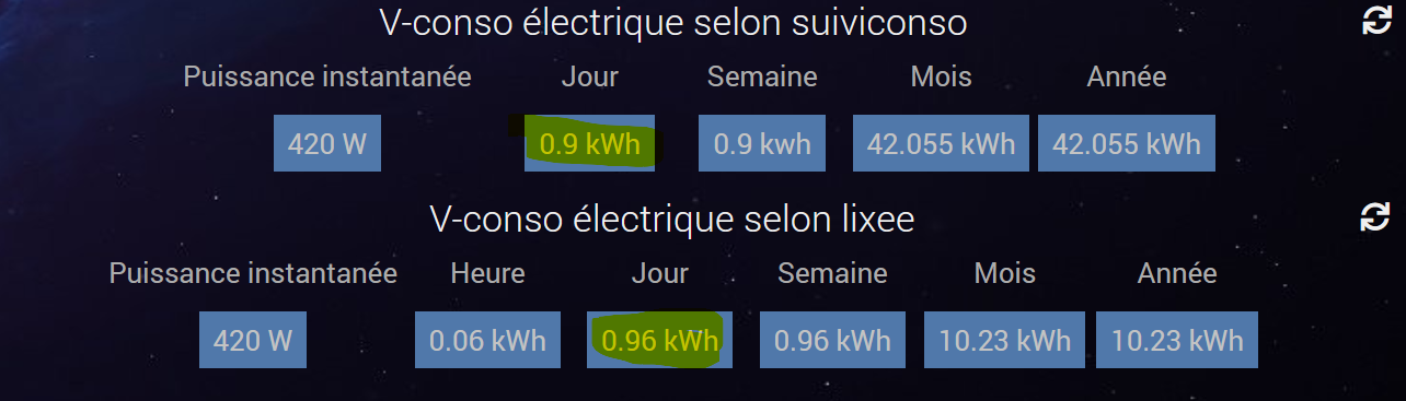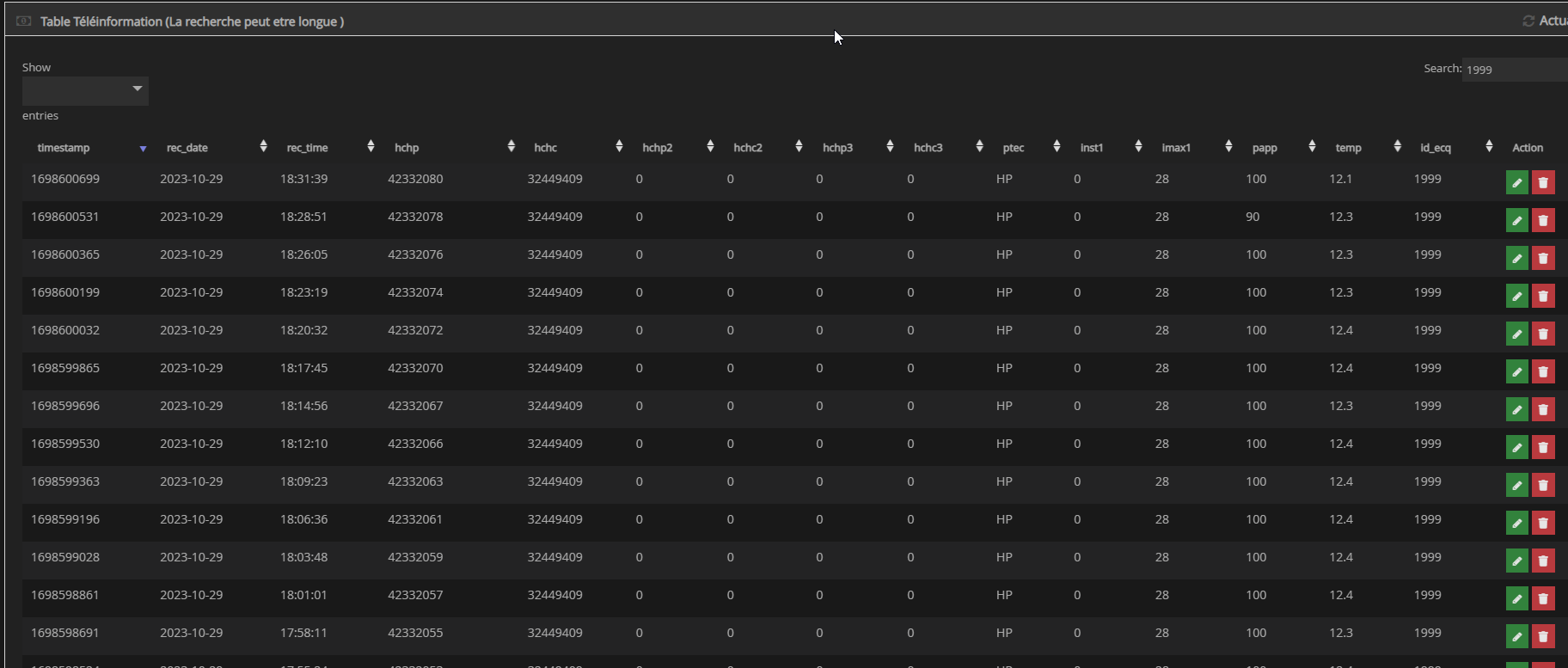 Ce qui est bizarre c’est qu’hier ça semblait fonctionner, j’ai dû toucher je ne sais quoi et là, je n’ai plus que ces valeurs. J’ai aussi essayé plusieurs fois de purger (pas de problèmes à le faire), de vider les historiques, lancer manuellement le cron updatetable rien à faire, je n’ai que l’index d’affiché. Je sais que suiviconso procède par différence mais il ne semble pas le faire. Pour le reste, la puissance instantanée remonte bien dans suiviconso.