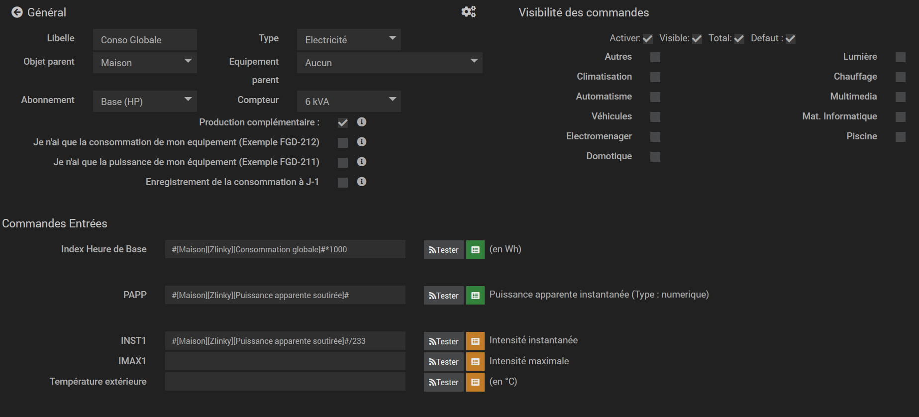 Problème, je n’arrive pas à configurer l’équipement « père ». Ou plutôt je n’y arrive plus, parce qu’hier il m’a semblé arriver à quelque chose mais ce matin j’avais des valeurs incohérentes. Voici une capture de la configuration de l’équipement qui prend ma conso globale, qui reprend en fait les données remontées par le Zlinky.