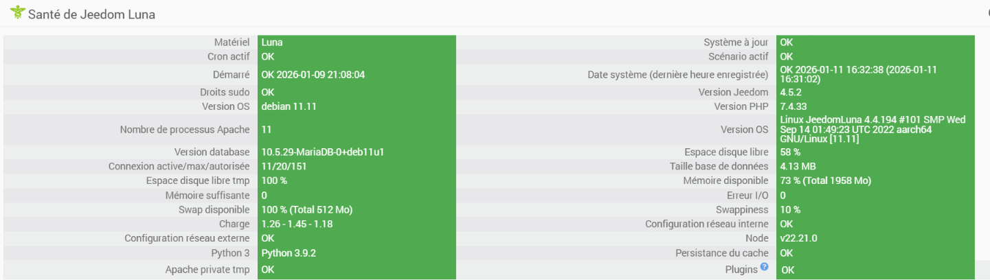 Je vais mettre la page santé en annexe, mais je n’ai pas de log à vous rapporter car apparemment tout marche… sauf que je n’ai pas de remontée d’information de toutes les clamps