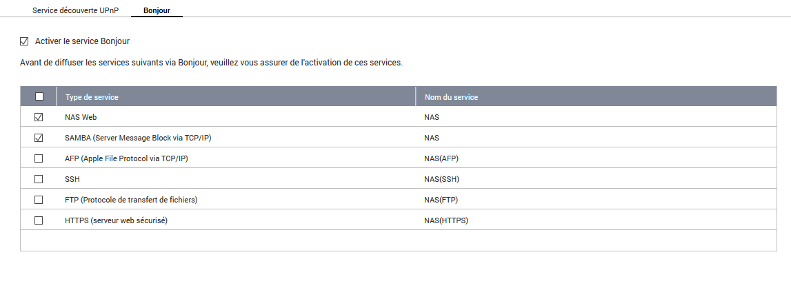 J’ai activé SAMBA au niveau de l’onglet découverte de Service > Bonjour