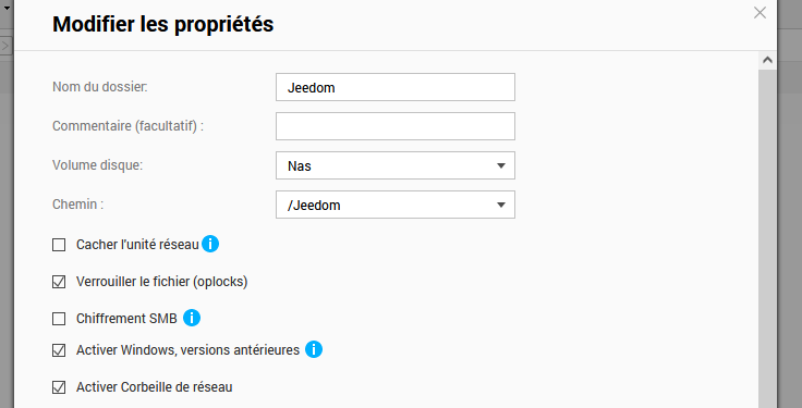 Un répertoire partagé Jeedom à la racine du NAS contenant un dossier « Backups ». Les droits de l’utilisateur Jeedom sont en lecture/écriture.