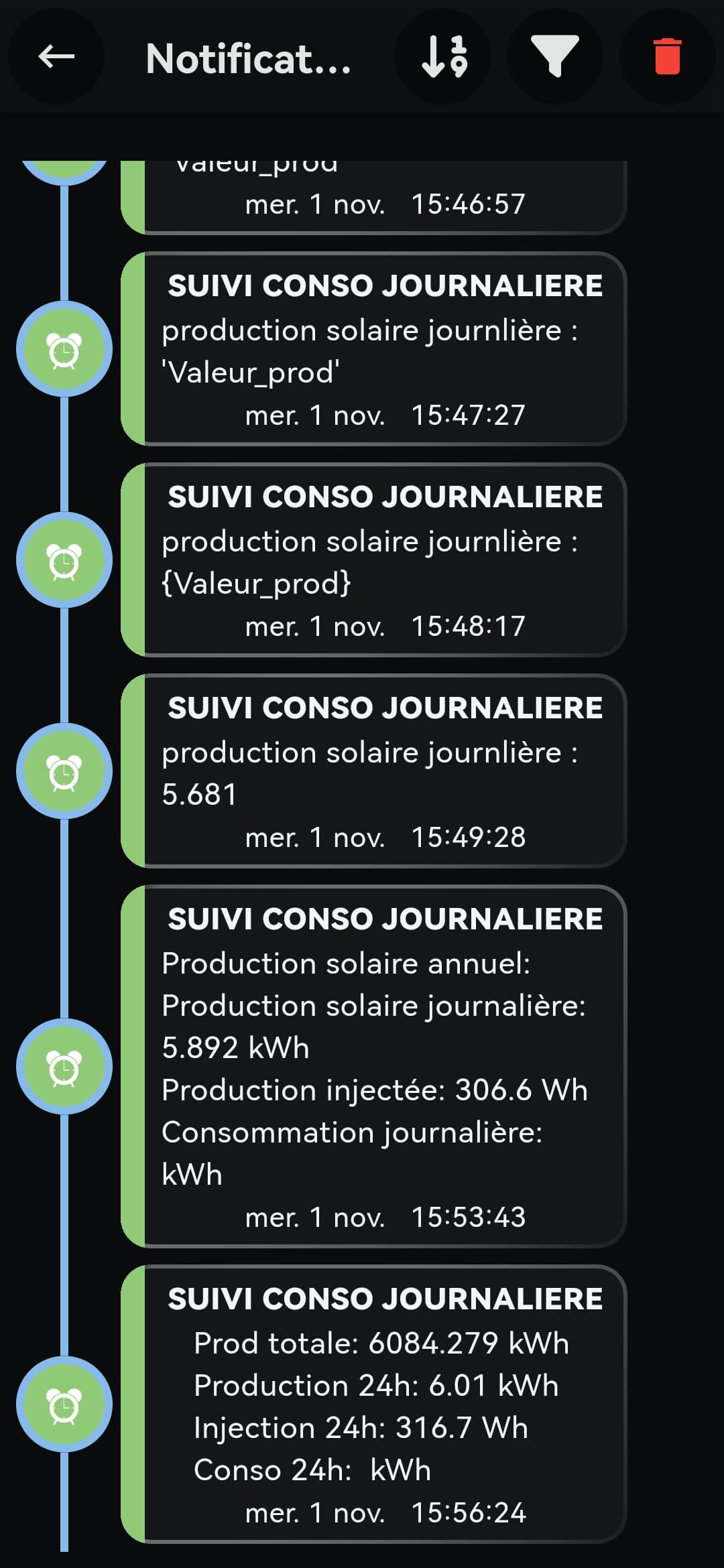 Je souhaiterai réaliser un petit scenario afin de recevoir une notification de mes consos d énergie et production solaire journalière a 23h59 avant que mon routeur solaire fasse un reset des données…?