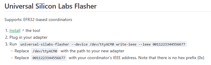 Run universal-silabs-flasher --device /dev/ttyACM0 write-ieee --ieee 0011223344556677